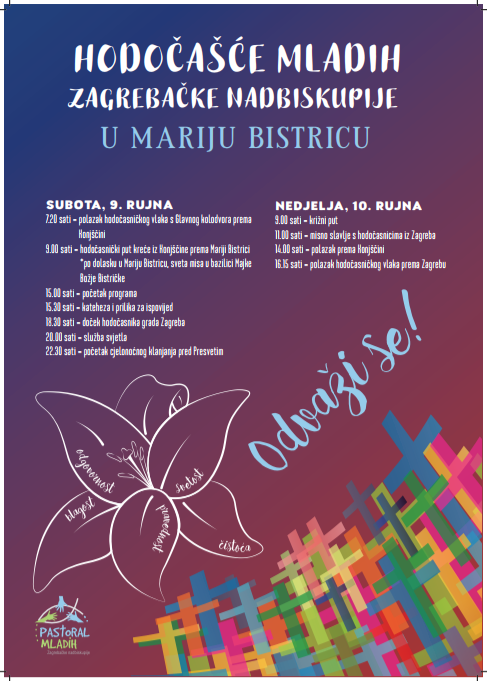 tradicionalno Hodočašće mladih Zagrebačke nadbiskupije Mariju Bistricu ove će se godine održati u subotu i nedjelju, 9. i 10. rujna pod geslom "Odvaži se" koji odgovara pozivu što ga je sveti Josip primio kako čitamo u evanđelju po Mateju (Mt 1,24)