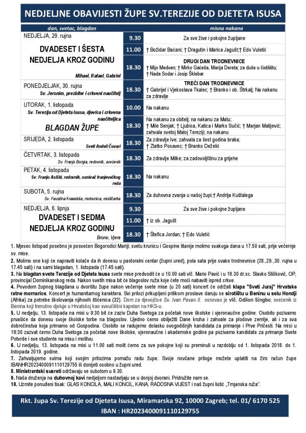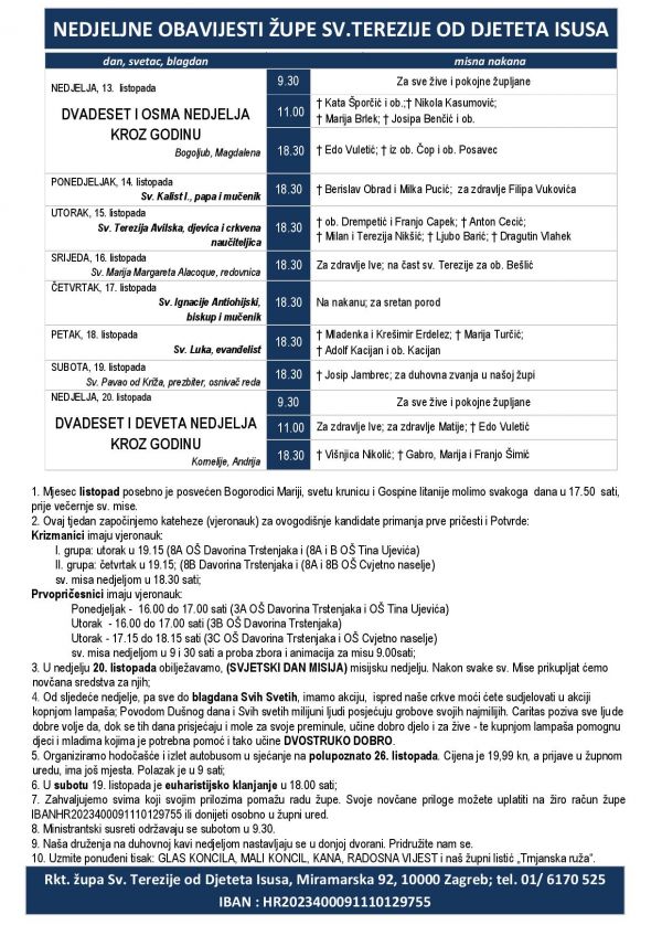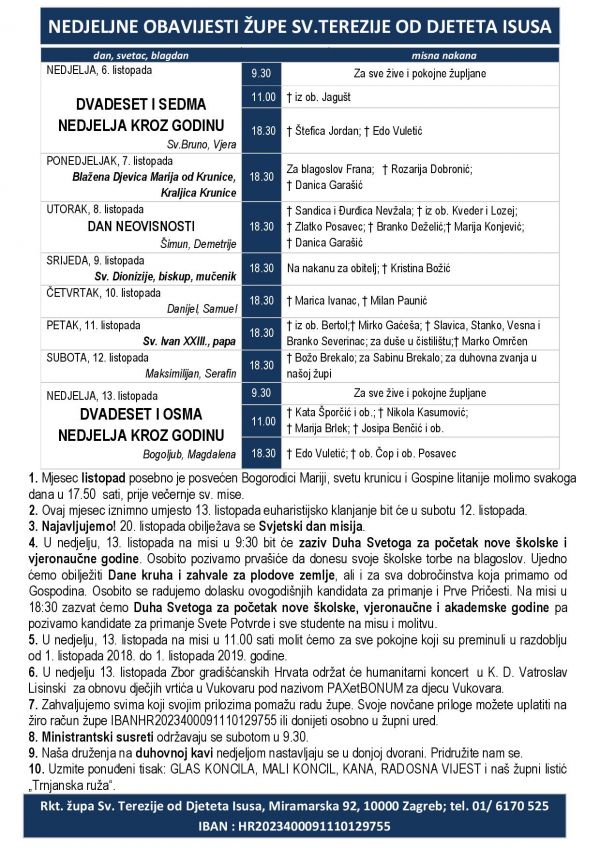 1. Mjesec listopad posebno je posvećen Bogorodici Mariji; svetu krunicu i Gospine litanije molimo svakoga dana u 17.50 sati, prije večernje sv. mise.