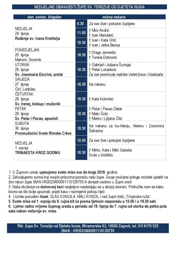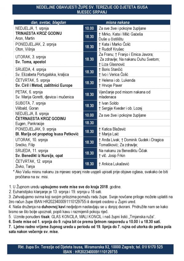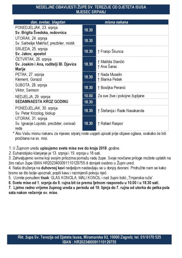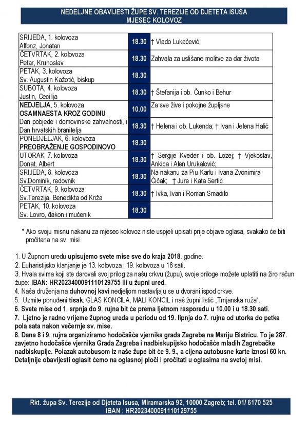 * Ako svoju misnu nakanu za mjesec kolovoz niste uspjeli upisati prije objave oglasa, svakako će biti pročitana na sv. misi.
