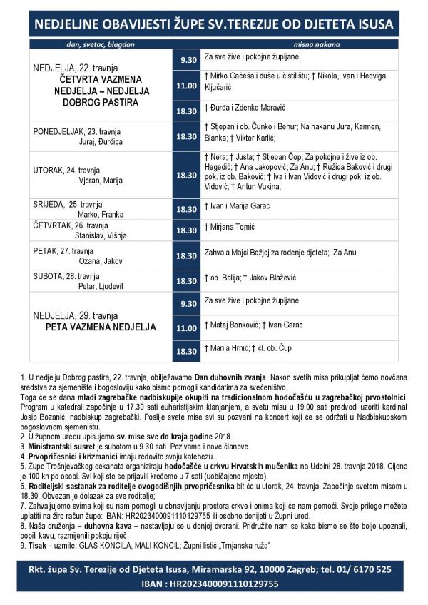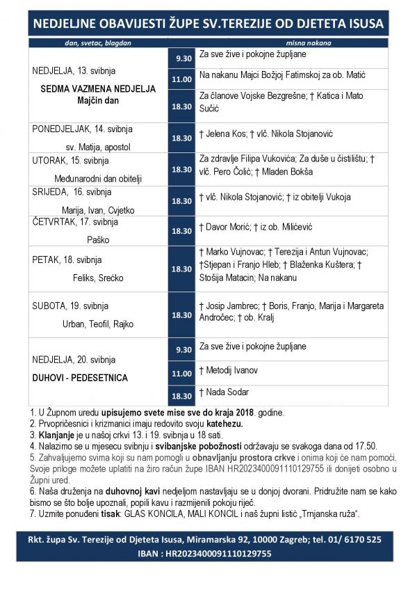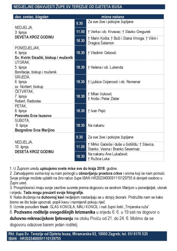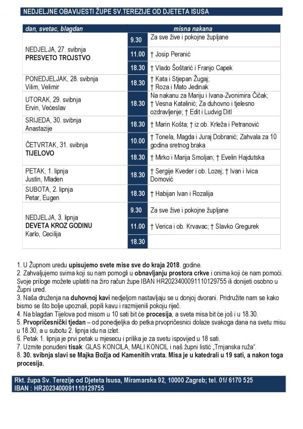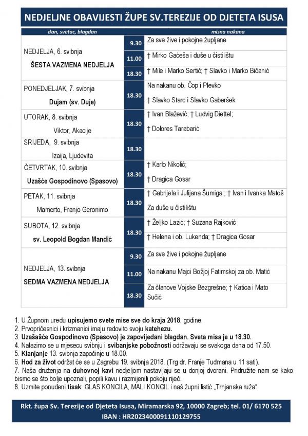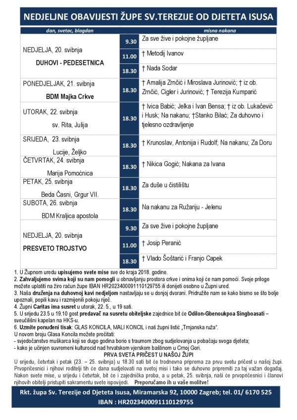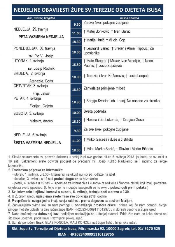 1. Slavlje sakramenta sv. potvrde (krizme) u našoj župi ove godine bit će 5. svibnja 2018. (subota) na sv. misi u 10 sati. Sakrament svete potvrde podijelit će prečasni mr. Josip Kuhtić Radujemo se i molimo za svoje krizmanike.
