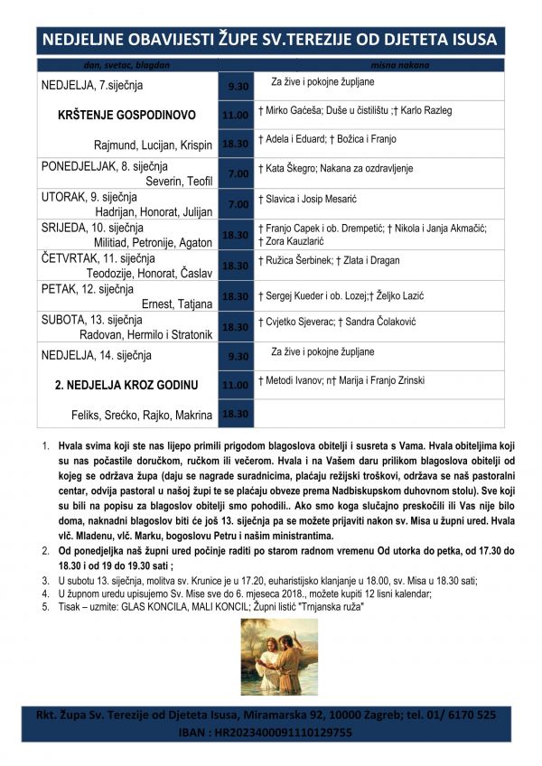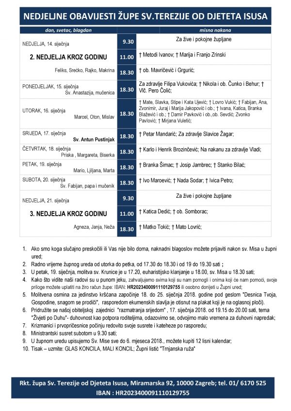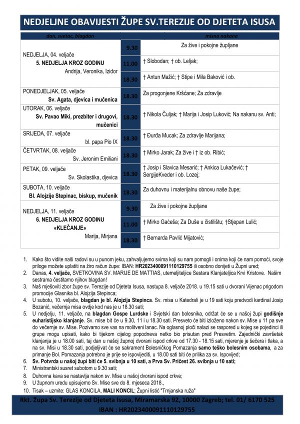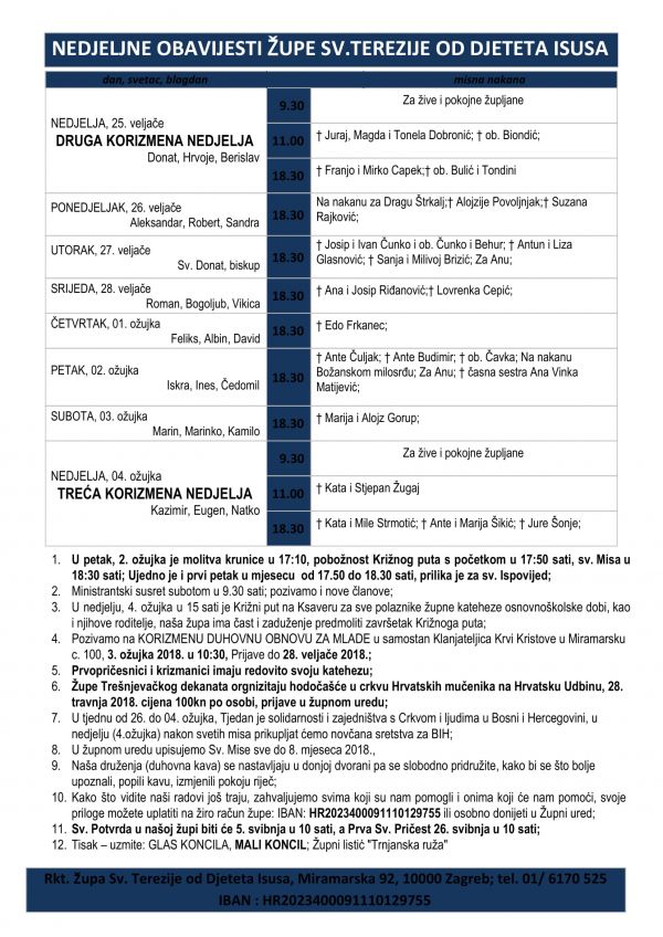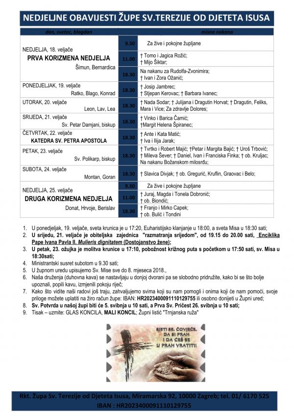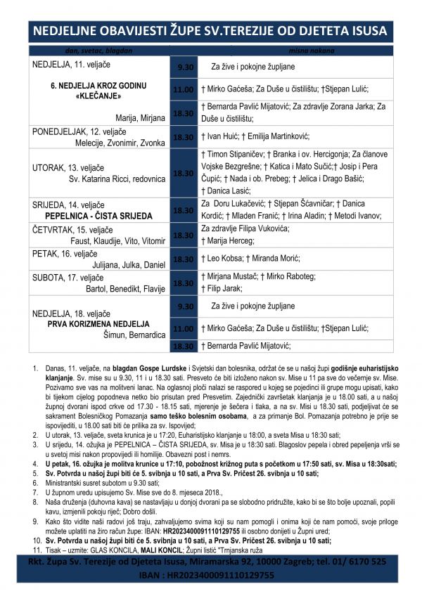 1. U ponedjeljak, 19. veljače, sveta krunica je u 17:20, Euharistijsko klanjanje u 18:00, a sveta Misa u 18:30 sati;