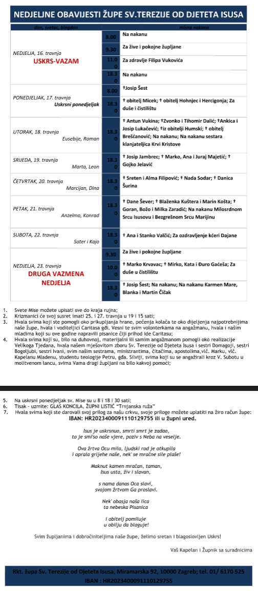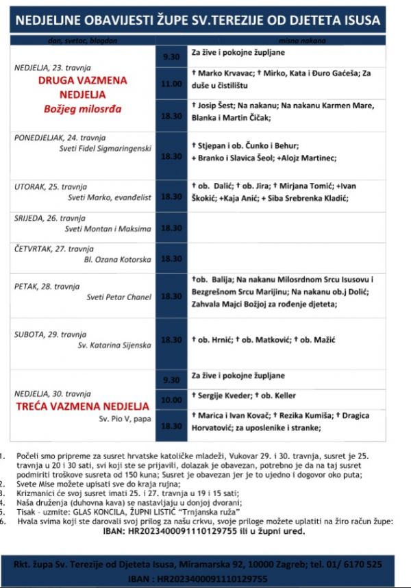 Počeli smo pripreme za susret hrvatske katoličke mladeži, Vukovar 29. i 30. travnja, susret je 25. travnja u 20 i 30 sati, svi koji ste se prijavili, dolazak je obavezan, potrebno je da na taj susret podmiriti troškove susreta od 150 kuna; Susret je obavezan jer je to ujedno i dogovor oko puta;