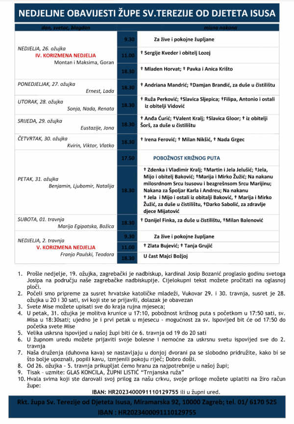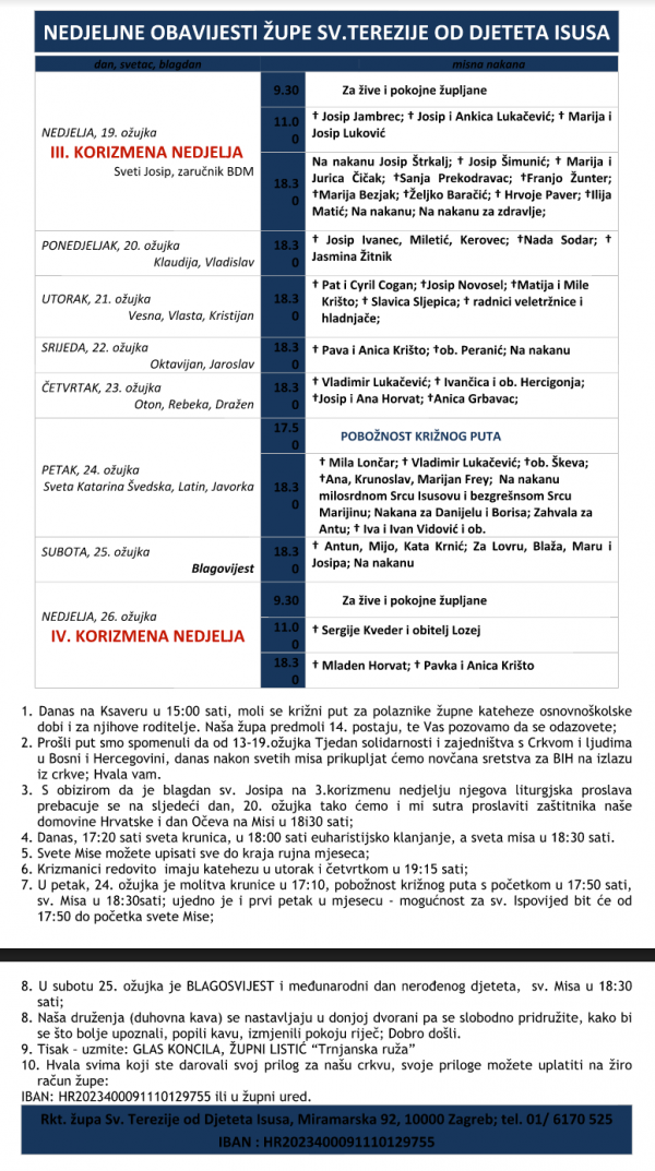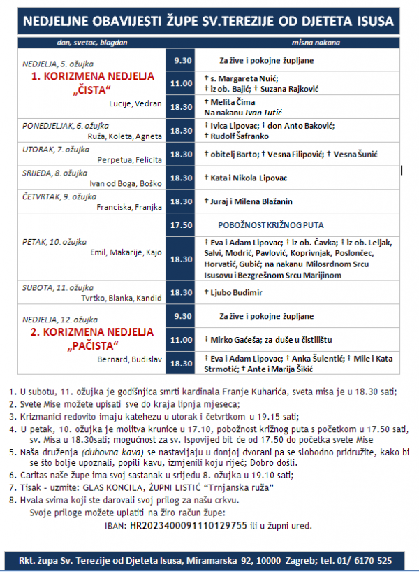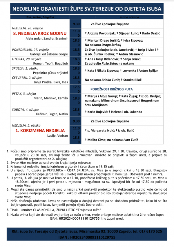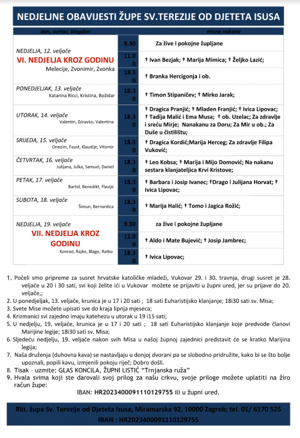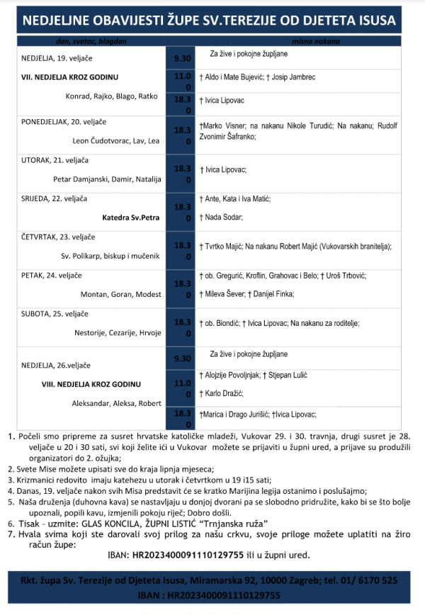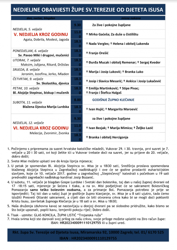 2. U ponedjeljak, 13. veljače, krunica je u 17 i 20 sati ; 18 sati Euharistijsko klanjanje; 18i30 sati sv. Misa;