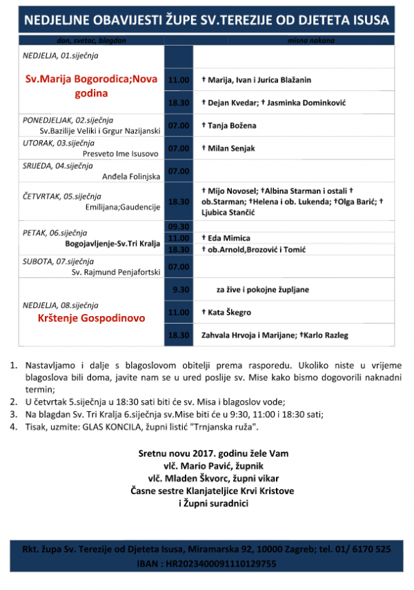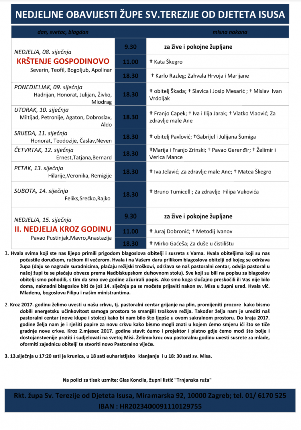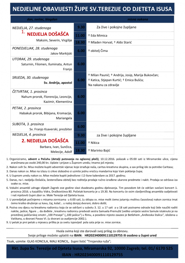 1. Organiziramo, advent u Pečuhu (detalji putovanja na oglasnoj ploči), 10.12.2016. polazak u 05:00 sati iz Miramarske ulice, cijena aranžmana po osobi 240,00 kn. Uplate i prijave u Župnom uredu; Imamo još mjesta;