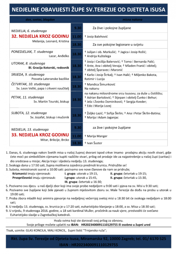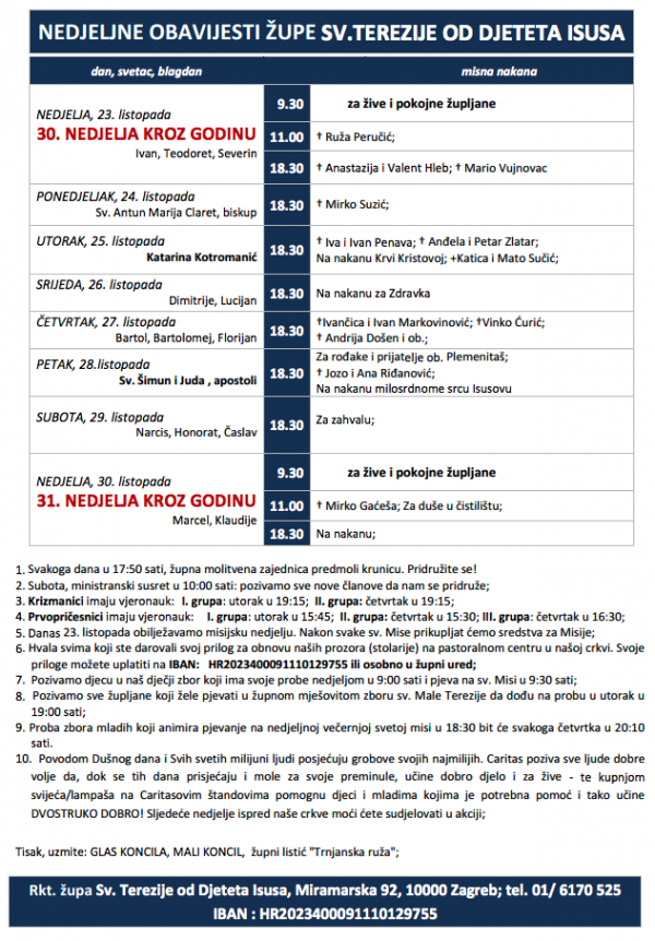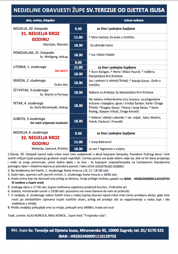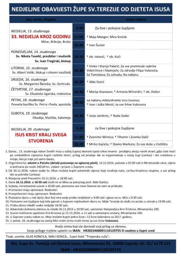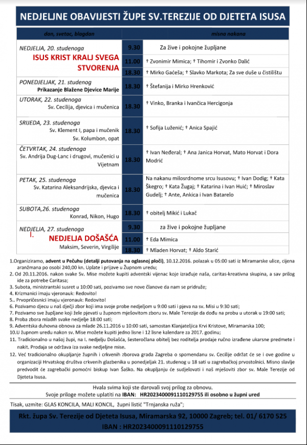 1.Organiziramo, advent u Pečuhu (detalji putovanja na oglasnoj ploči), 10.12.2016. polazak u 05:00 sati iz Miramarske ulice, cijena aranžmana po osobi 240,00 kn. Uplate i prijave u Župnom uredu;